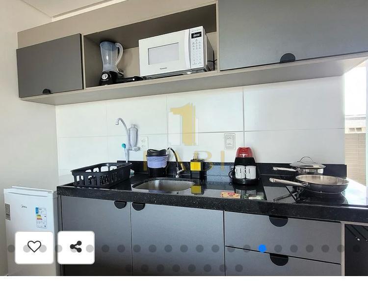 Cozinha compacta e equipada com bancada em granito, frigobar, micro-ondas, cooktop, cafeteira, liquidificador e armários planejados.