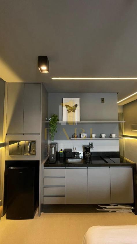 Cozinha planejada com cooktop, micro-ondas, frigobar, cafeteira, utensílios e louças